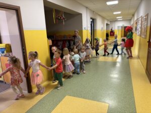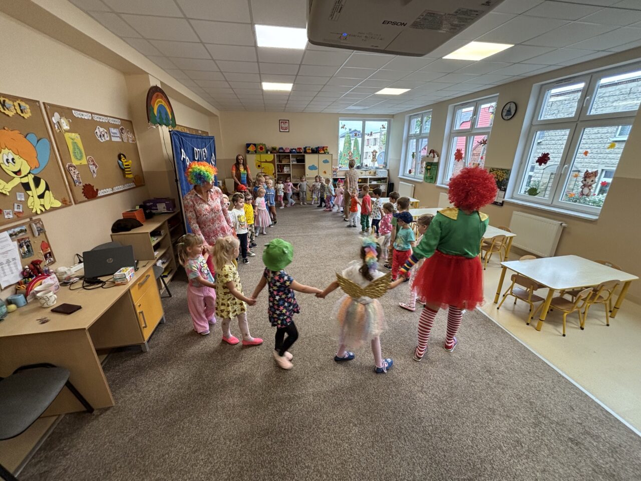 Tego dnia przedszkolaki przyszły do przedszkola w barwnych, wesołych strojach, które wprowadziły wszystkich w prawdziwie radosny nastrój. W salach rozbrzmiewała muzyka, przy której dzieci tańczyły, śpiewały i brały udział w zabawach integracyjnych.