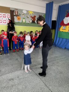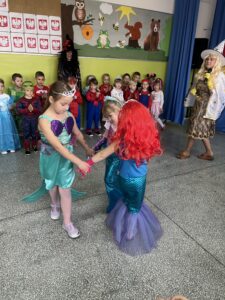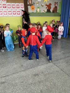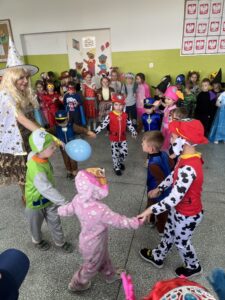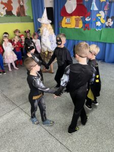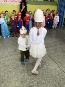 Podczas spotkania dzieci mogły zaprezentować swoje przebranie i opowiedzieć, jaką postać przedstawia. Wspólnie rozmawialiśmy o znanych bajkach, ich bohaterach oraz o tym, czego mogą nas nauczyć.
