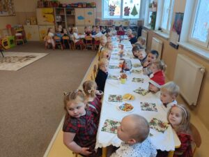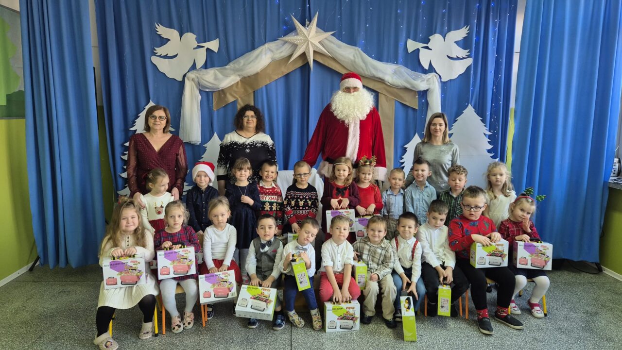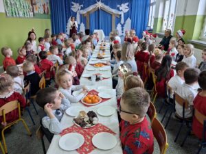 19 grudnia w naszym przedszkolu odbyła się uroczysta Wigilia przedszkolna. Dzieci wspólnie usiadły do wigilijnego stołu, dzieląc się opłatkiem i składając sobie świąteczne życzenia. W trakcie spotkania został również przeczytany fragment Biblii, który wprowadził wszystkich w wyjątkowy, świąteczny nastrój.
